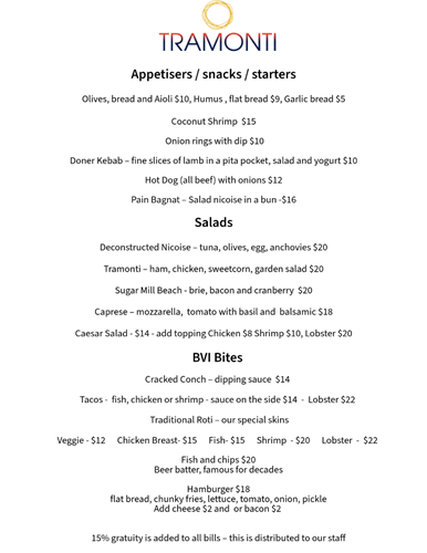 and some British, US and BVI favorites like Fish and chips, the BVI's best Hamburger , Rotis, Fish tacos etc