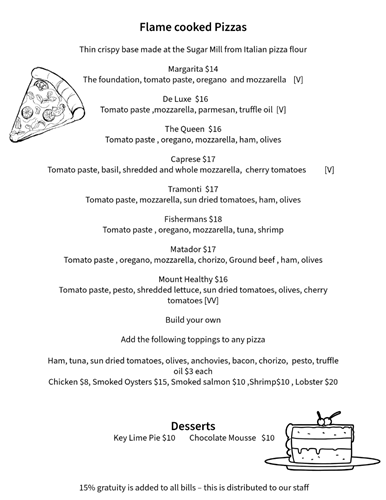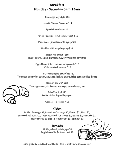 The Sugar Mill - a fine dining restaurant featuring fresh lobsters, the best steak in our "Steak Bar" , Tournados Rossini, Scallops in champagne sauce, pate de foie gras, escargots, gourmet risottos , duck ,chicken curry and roulade, white fish as well as vegetarian and Caribbean specialities.