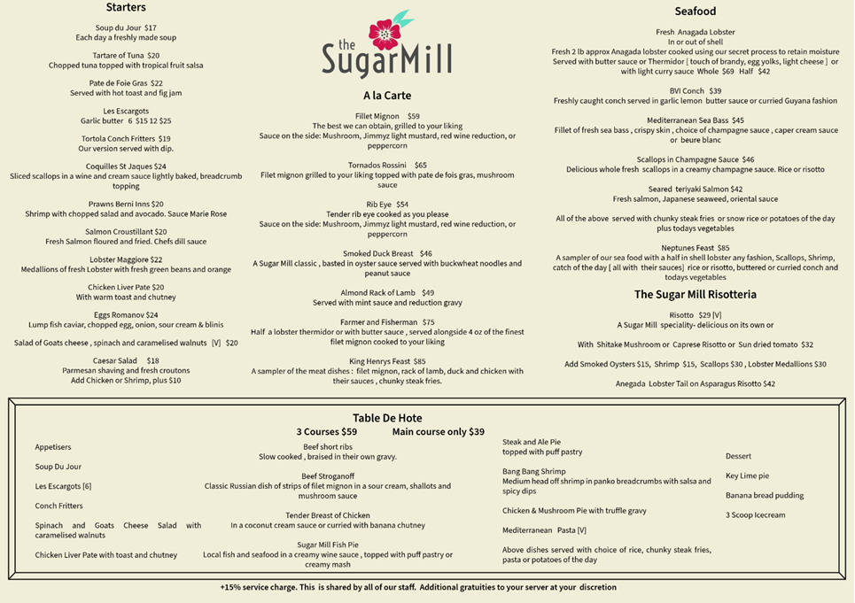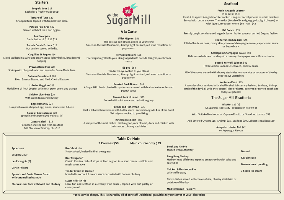 The Sugar Mill - a fine dining restaurant featuring fresh lobsters, the best steak in our "Steak Bar" , Tournados Rossini, Scallops in champagne sauce, pate de foie gras, escargots, gourmet risottos , duck ,chicken curry and roulade, white fish as well as vegetarian and Caribbean specialities.