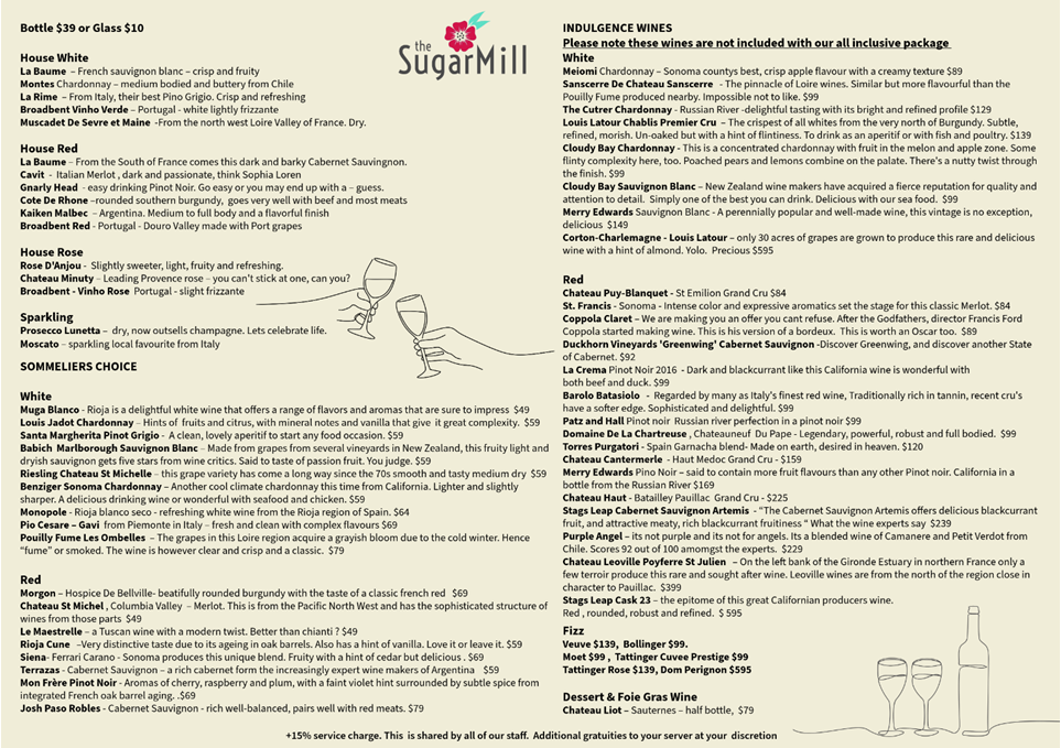 Sugar Mill features an extensive wine list from inexpensive sipping wines to Chateau bottled Premiere Cru