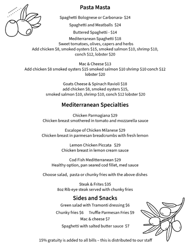 cracked conch, chicken Parmagiana, Steak and Frites, lemon chicken piccata