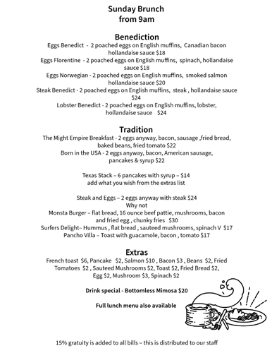 and some British, US and BVI favorites like Fish and chips, the BVI's best Hamburger , Rotis, Fish tacos etc